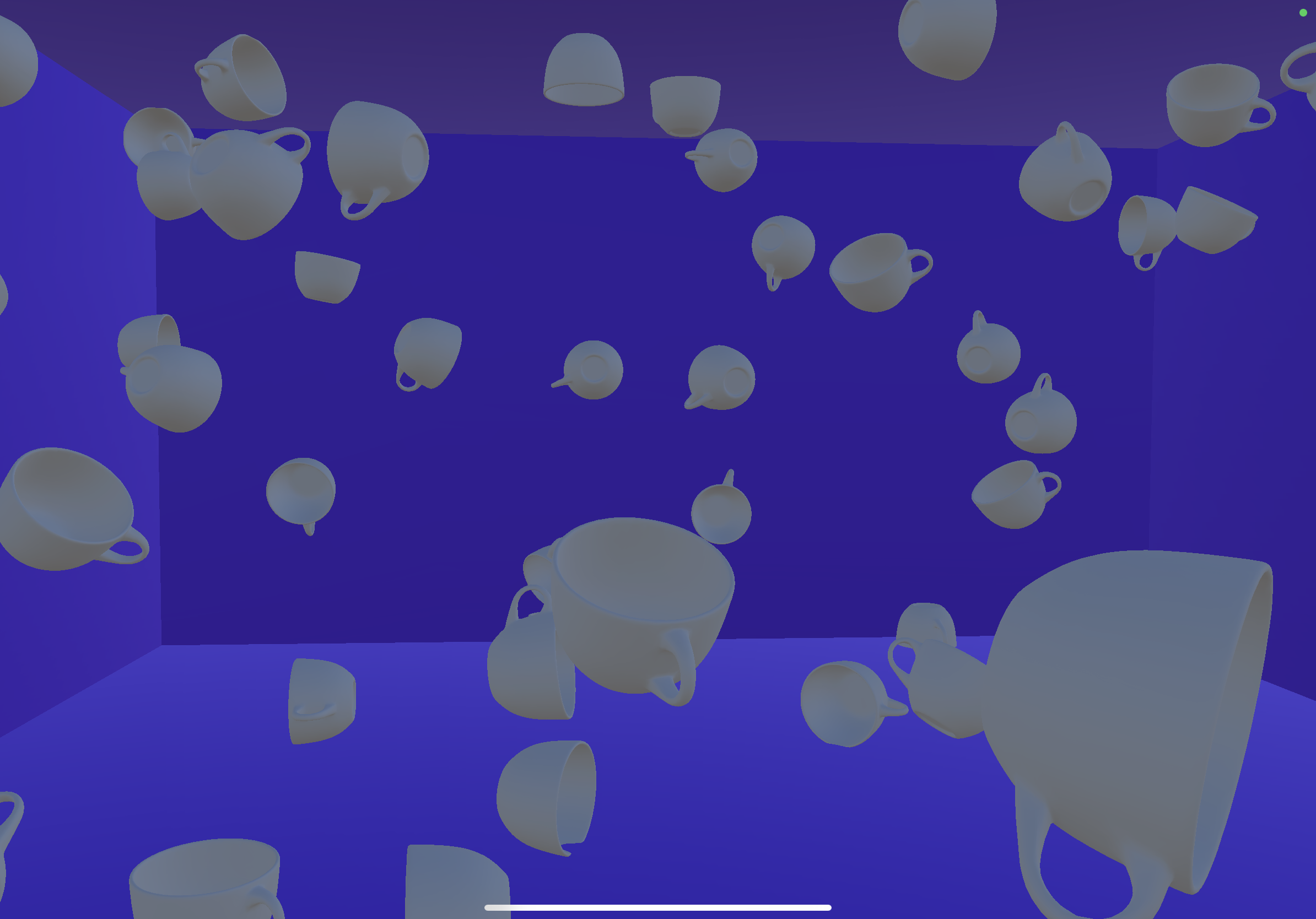 Experiment wiht things buoncing of the walls, we remade the bouncing balls I made on tuesday, keeping the movment but replacing balls with random objects, filled the room with teacups!